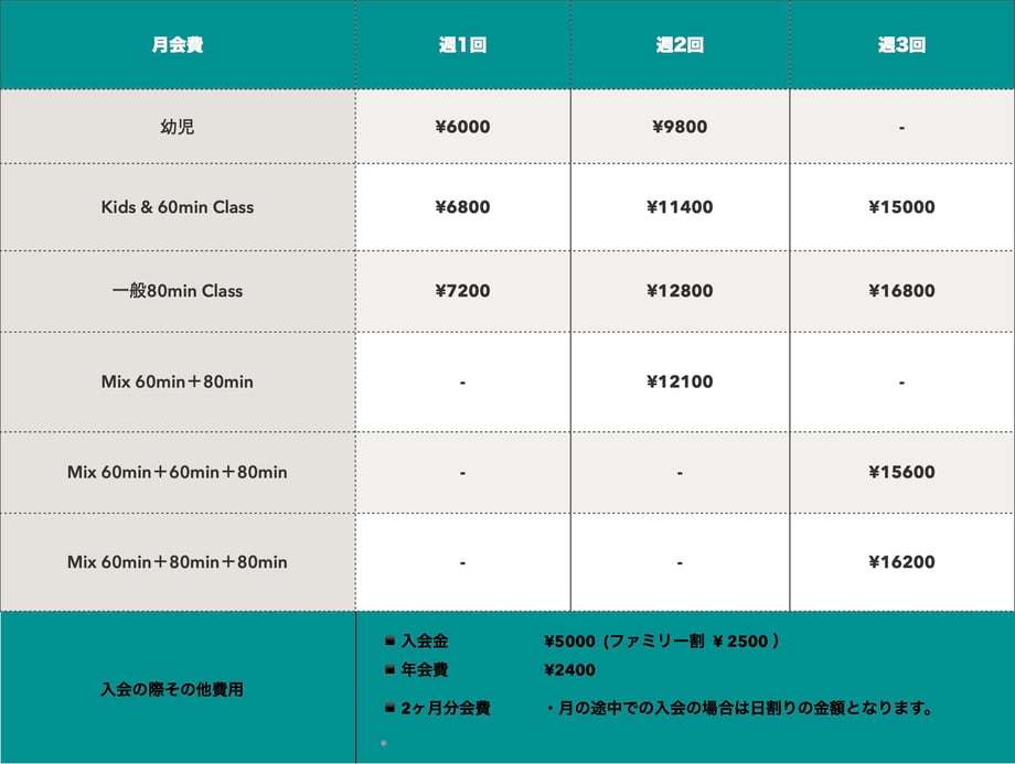 5週目などの特別レッスンは幼児クラス¥1500、キッズ/60分クラス¥1600、一般80分クラス¥1700にて受講していただけます。