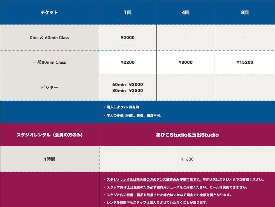 当スタジオインストラクターへの過度な連絡やレッスン、発表会、イベントにて迷惑を及ぼす行為や発言があった場合はその後の受講をお断りする場合がございます。